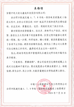 ? ? ? ? 7月31日,在合肥市軌道交通6、7、8號線一期供電系統(tǒng)集成2標(biāo)段表彰會上,公司被中鐵十二局集團電氣化工程有限公司授予“優(yōu)秀供應(yīng)商”稱號,標(biāo)志著公司憑借過硬的品牌實力、卓越的產(chǎn)品品質(zhì)、專業(yè)的服務(wù)團隊再獲肯定。