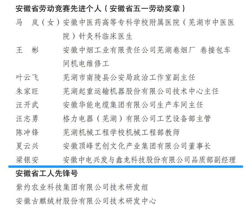 ? ? ? ? “五一”國際勞動節(jié)到來之際,省勞動競賽委員會、省總工會發(fā)布《關(guān)于表彰2023年度安徽省勞動競賽先進(jìn)集體、先進(jìn)個人和安徽省五一勞動獎、工人先鋒號的決定》對先進(jìn)集體、先進(jìn)個人全省表彰。公司品質(zhì)部副經(jīng)理梁銀安榮獲“2023年度安徽省勞動競賽先進(jìn)個人(安徽省五一勞動獎?wù)拢狈Q號。